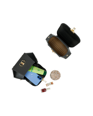 Le contraste des matières, le fermoir bijou doré et la poignée rigide lui confèrent un style chic intemporel.